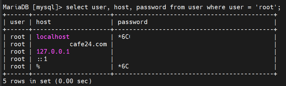 password를 입력해주거나 해당 호스트 로우를 삭제해줘도 된다.