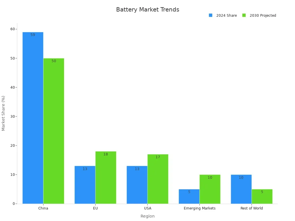 - 중국: CATL (36~38%), BYD (16~17%) – LFP(리튬인산철) 배터리로 저가 경쟁력 강함.