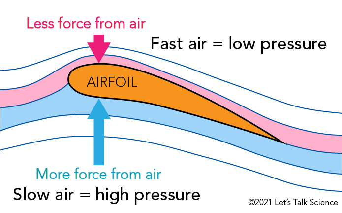 - 날개 위쪽: 곡면 때문에 공기가 더 빨리 흐름 (코안다 효과로 공기가 표면에 붙어 흐름).