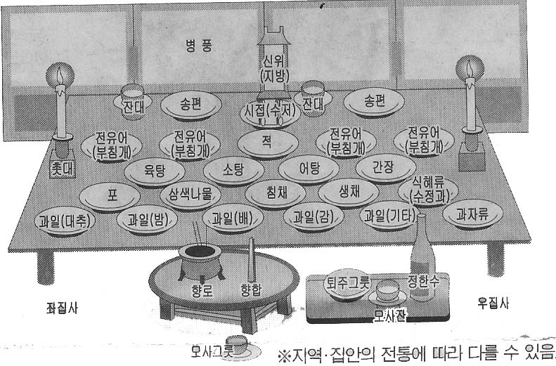 - 홍동백서(紅東白西): 붉은 과일(대추)은 동쪽, 흰 과일(배)은 서쪽.