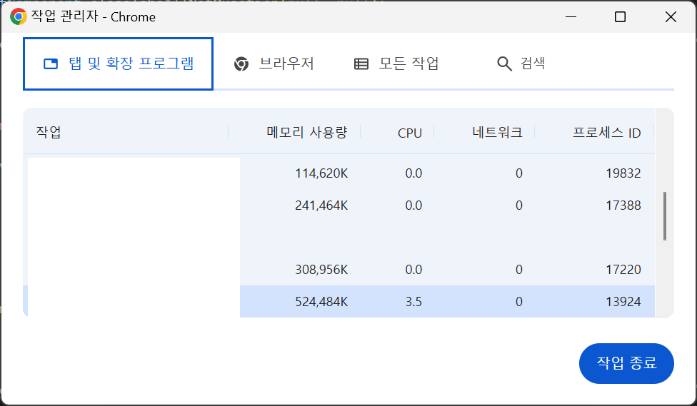 - 프로세스 이름: 탭(예: "example.com - Google Chrome")이나 확장 프로그램(예: "AdBlock")을 나열.