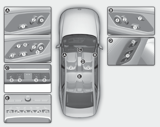 [A]는 시트 쿠션 측면 기본 조절 패널, [B]는 등받이 측면 세부 조절, [C]는 열선/통풍(센터 콘솔이나 도어), [D]는 동승석 전용(시트 측면이나 앞쪽)을 의미합니다.