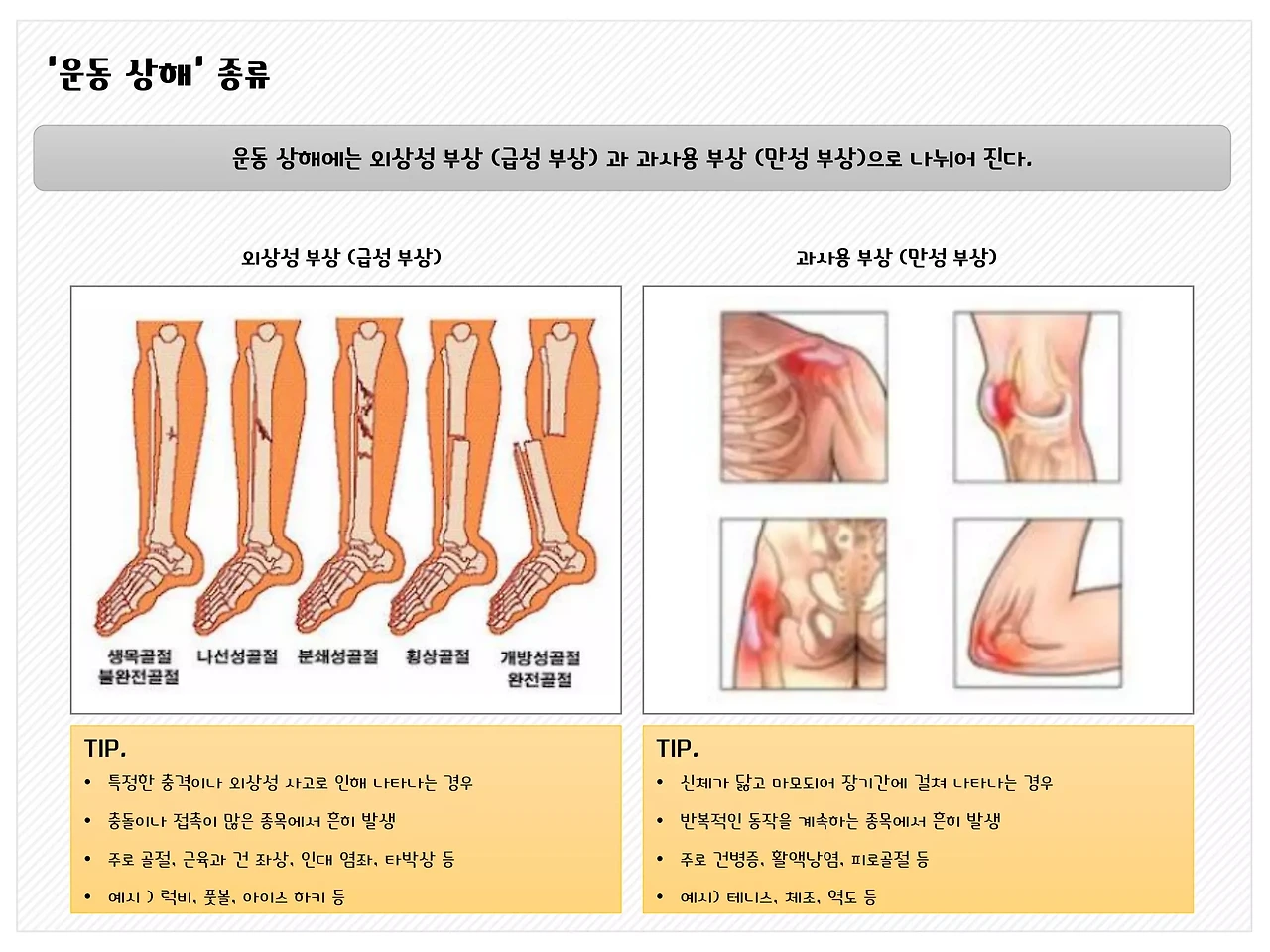 - 증상 시 바로 휴식! (피로, 통증 지속)