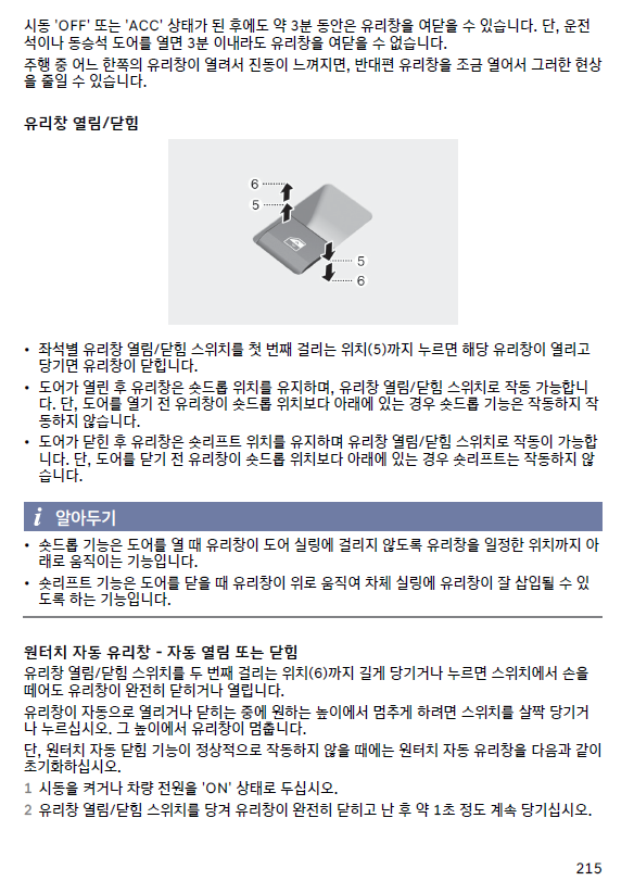 - 창문을 내린 상태에서 시작하지 말고, 중간 위치에서 완전히 내린 후 올리세요.