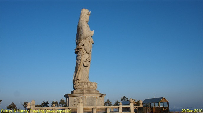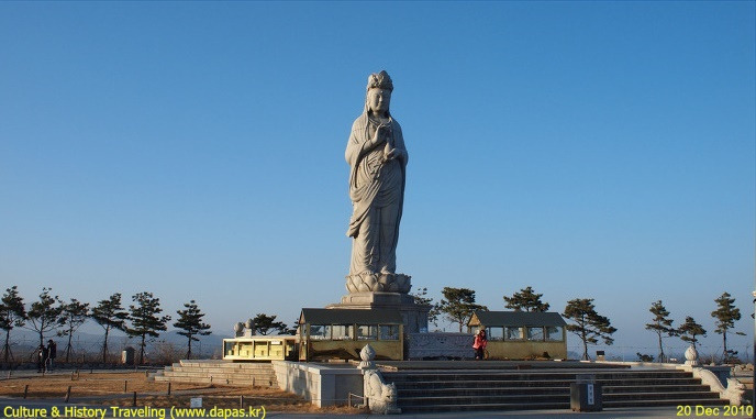 - 높이 16m의 거대한 관음보살상. 동해바다를 내려다보는 자비로운 모습이 인상적.