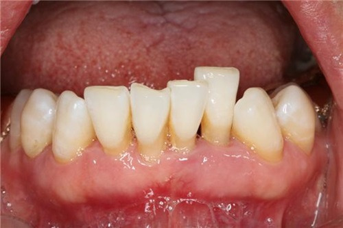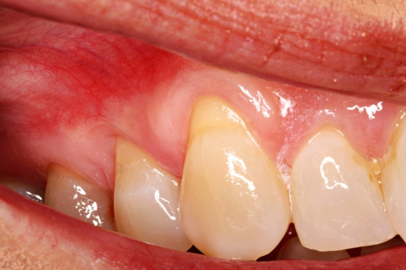 (잇몸 내려앉음 예시: 치아 뿌리가 노출되거나 잇몸이 붉고 부은 경우)