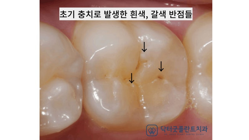 (초기 충치 예시: 검은 점이나 얼룩이 보이는 경우)