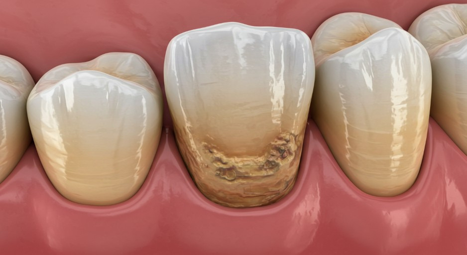 (치경부 마모 예시: 치아 목 부분이 패이거나 노출된 경우)